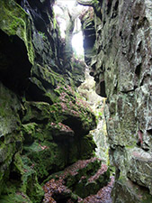 Lud's Church (sometimes written as Ludchurch) is a deep chasm penetrating the Millstone Grit bedrock created by a massive landslip on the hillside above Gradbach. It is over 100 metres long and 18 metres deep, mossy and overgrown, wet and cool even on the hottest of days.